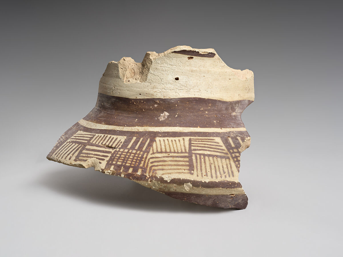 This sherd comes from the shoulder of a ceramic jar, likely one with a squat, globular body and a flaring rim. It is made of a buff clay with a cream slip, with painted brown geometric decoration on the exterior. It was excavated at Tall-i Nokhodi, a prehistoric site in southwestern Iran occupied during the fourth and third millennia B.C. Excavations have been limited in scope, but the presence of ovens there suggest it was a small settlement. Metal finds from the site, including a cast bronze axe head, indicate a precious metalworking industry there, one which prefigures the magnificent and extensive bronzeworking of the neighboring Elamites in centuries to come.