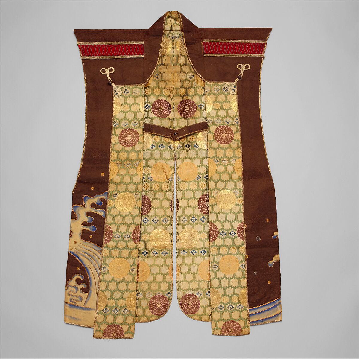 A high-ranking samurai would have worn a jinbaori like this over his armor for protection against the elements and as a display of his status and his mon (family crest). The mon on the back of this example, three oak leaves within a circle, belongs to the Makino family, who were daimyo (feudal lords) of Tanabe (modern day Kyoto Prefecture). The elaborate lining, high quality of the materials and fine workmanship distinguish this example as one of the finest of its period.