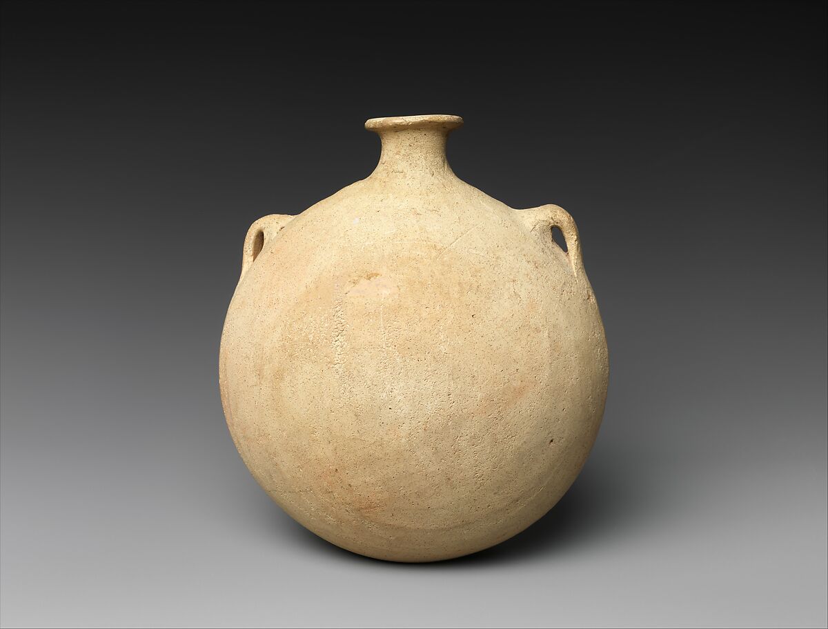 Vessels of this shape are often called ‘pilgrim flasks’ because of their resemblance to the souvenir vessels sold at Christian pilgrimage sites around the Mediterranean, beginning in the late Roman Empire. Yet this shape existed long before the advent of Christianity, so this term is somewhat misleading. The small size and narrow mouth of this vessel certainly lend themselves to its use as personal flask for water or some other drink, much like a modern canteen.