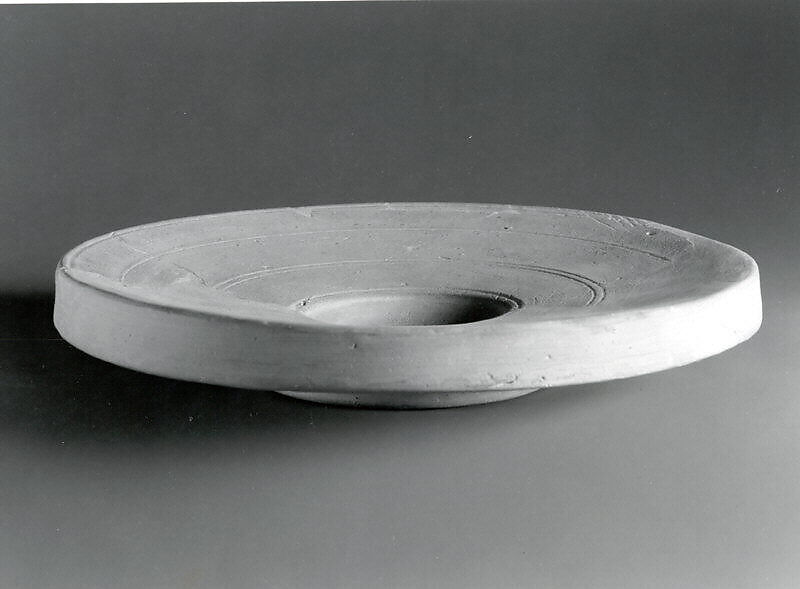 This ceramic plate, which has been heavily restored, has a ring base and a hanging rim. The interior is decorated with concentric incised lines, and there is a round depression in the center. It is made of a gray clay. It was excavated at Pasargadae in southwestern Iran, about 90 km northeast of Shiraz. Pasargadae was the first capital of the Achaemenid Persian Empire, founded by Cyrus the Great c. 546 B.C. The plate was found at the Tall-i Takht, a massive artificial platform presumably built as the site of a royal palace but converted into a fortified compound after Darius established a new capital at Persepolis around 520. However, the coin hoards and other finds from the Takht, including this plate, show that it continued to be occupied down into the second century B.C., long after the fall of the Achaemenid Empire. This plate was found near the fortification wall of the northern side of the Takht.