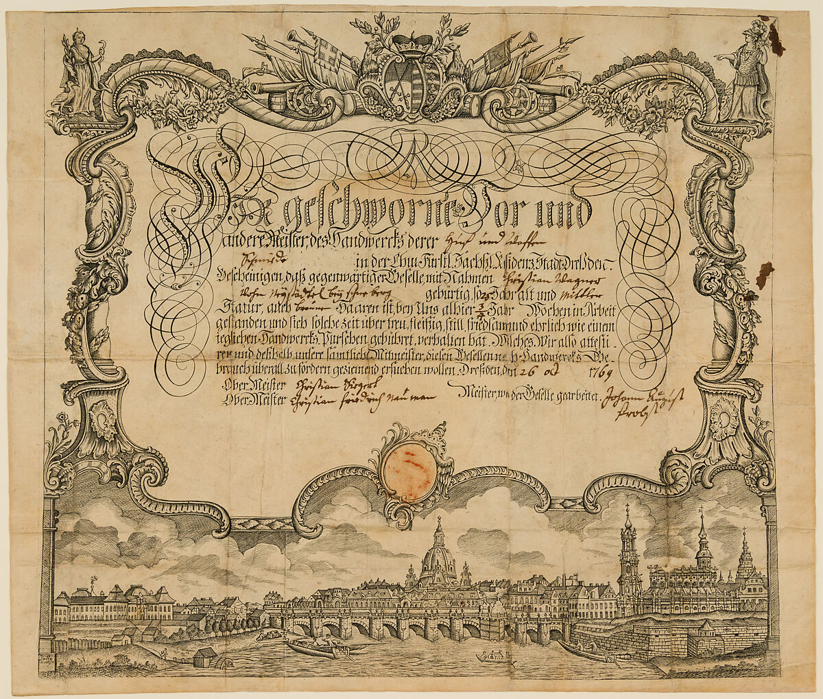 - Title:Certificate of Employment (Arbeitsbescheinigung) of the Guild of Farriers and Weaponsmiths (Huf- und Waffenschmiede) of Dresden