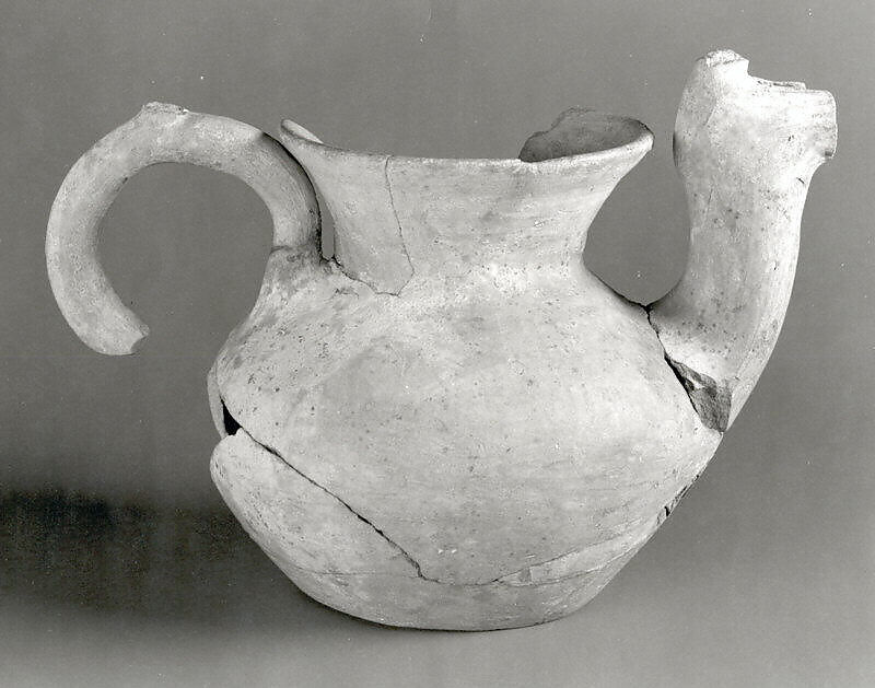This spouted jug has a globular body, a flat base, and a high flaring rim. On one side is a looped handle with a tab at the top for the thumb, and on the other is a spout that rises upward from the jug’s body before extending out horizontally, though only a little bit of it remains. It is made of a pale, light pink clay, using a potter’s wheel, with the handle and spout added. It was excavated at Shahr-i Qumis in northern Iran, which has been identified as the ancient city of Hecatompylos, established by the Parthians as their capital by about 200 B.C. In Greek Hecatompylos means ‘a hundred gates,’ suggesting that the city was quite large. Indeed, the modern archaeological site includes several mounds, only a few of which have been excavated, and a vast area covered with potsherds. This vessel was found in a large building at Site V, which has been tentatively identified as an elite residence. This building was completely filled with dirt sometime in the late 1st century B.C. or early 1st century A.D., perhaps when the Parthian capital was moved elsewhere and the city’s elite residents left with it.