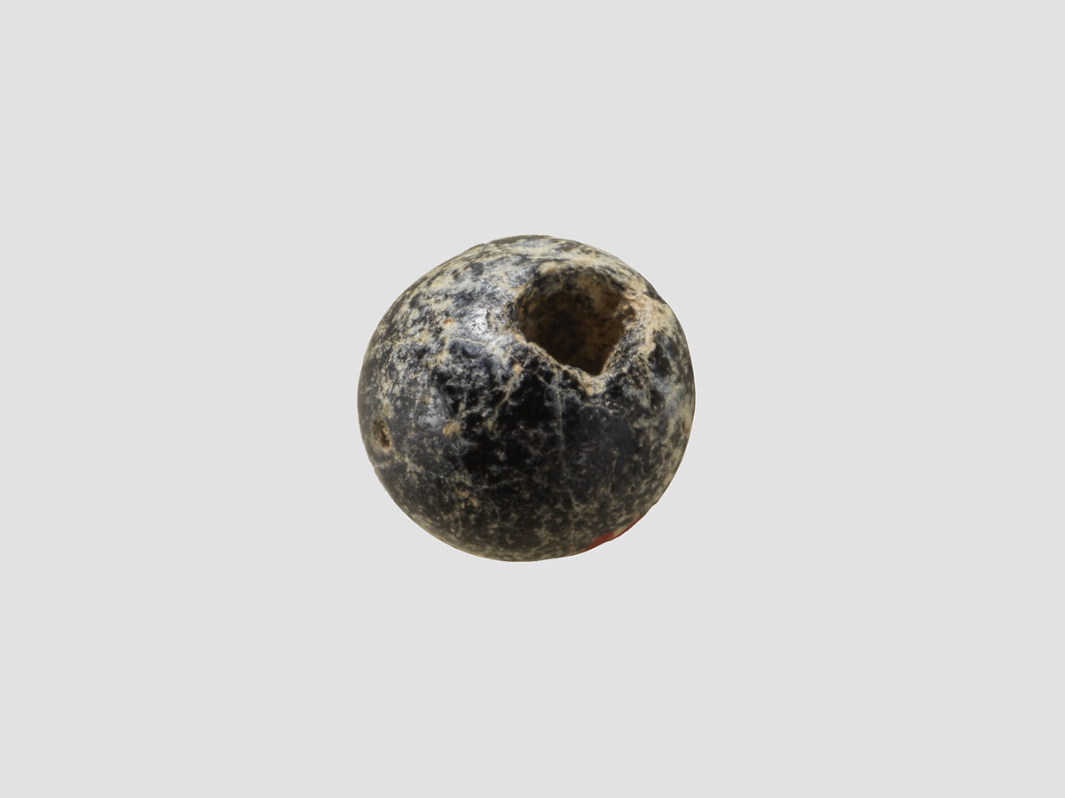 The round glass bead was excavated at Shahr-i Qumis in northern Iran, which has been identified as the ancient city of Hecatompylos, established by the Parthians as their capital by about 200 B.C. In Greek Hecatompylos means ‘a hundred gates,’ suggesting that the city was quite large. Indeed, the modern archaeological site includes several mounds, only a few of which have been excavated, and a vast area covered with potsherds. This bead comes from Site VII, a building which may have originally been an elite residence but which was subsequently reused as a funerary structure.