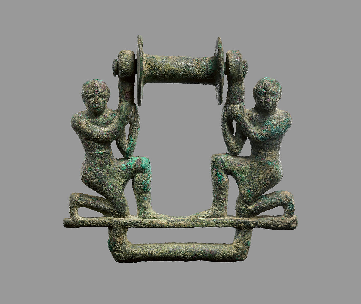 Although the precise function of bronze rollers remains unclear, the roller and the aperture at the bottom of this example suggest that it would have been used with a cord, strap, or fabric. The appearance of the two fully modeled male figures – shaved except for a forelock and wearing short belted kilts – may characterize them as temple attendants. It has been suggested that openwork bronzes may have been affiliated with the temple, used either in the production of textiles or as elements of temple furniture. Other proposals identify objects like this as horse trappings or belt buckles.