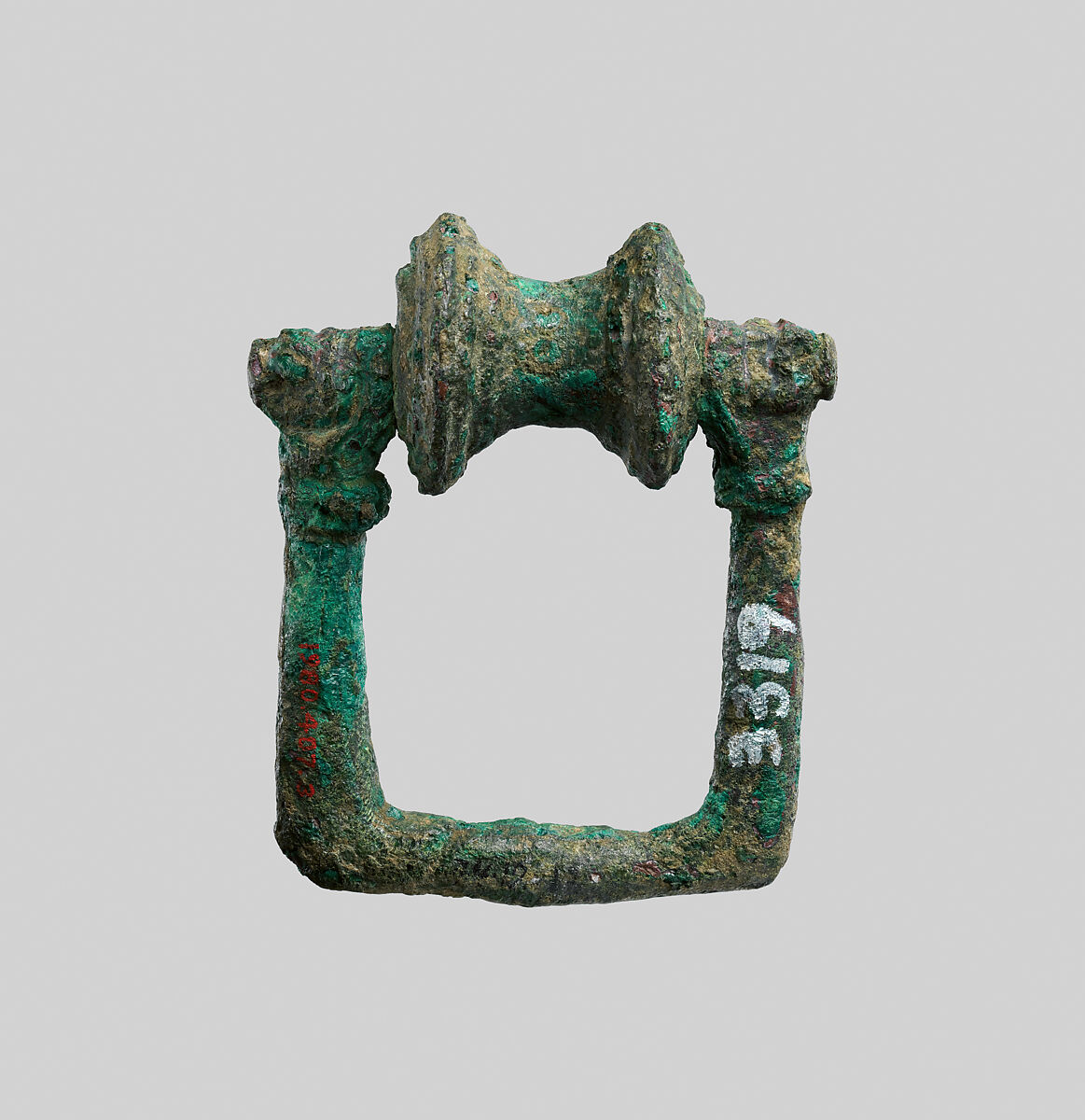 This bronze openwork piece comprises a roller on a pin and a square frame that takes the appearance of two outstretched arms with bracelets at the wrists. Although the exact function of this object is unknown, the rotating roller suggests that a cord, strap, or other piece of fabric would have been fed through the opening. Objects like this roller may have been used as horse trappings, belt buckles, furniture elements, and implements used in the production of textiles.