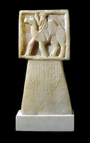 This fine male portrait head is thought to date from the middle of the first millennium A.D. and may have been part of a larger royal sculpture. The figure is wearing a stylized laurel wreath, a symbol of high rank. The use of the wreath to denote status reflects the influence of the Graeco-Roman world and appears in more realistic form on the coins of the kingdom of Himyar from the first centuries B.C. and A.D. A long mustache drapes along each side of the mouth, the chin is bearded, and a single ringlet is carefully carved on the surface of the left cheek. This last detail is undoubtedly significant since it is, to this day, characteristic of the hairstyle of Yemeni Jews. In the fourth century A.D. many of the kings of Himyar were converted to Judaism, so this feature may eventually aid in the identification of the figure. Carved from translucent alabaster with beautifully polished surfaces, this portrait is a notable example of the art of ancient Arabia.