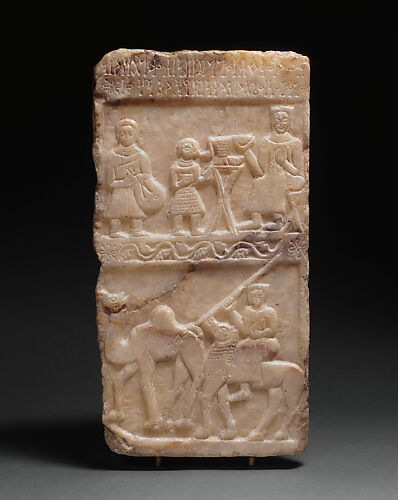 This highly polished alabaster stele is made of two pieces. A smooth undecorated slab sits in a socket carved into a stepped base. Inscribed in Sabaic letters in two rows on the base is “DRMT SFLYN.” This name, "Dhurmat (of the clan) Safalin” identifies the person, perhaps a woman, who dedicated the monument. The shapes of the letters allow us to date this object to the late first millennium B.C.