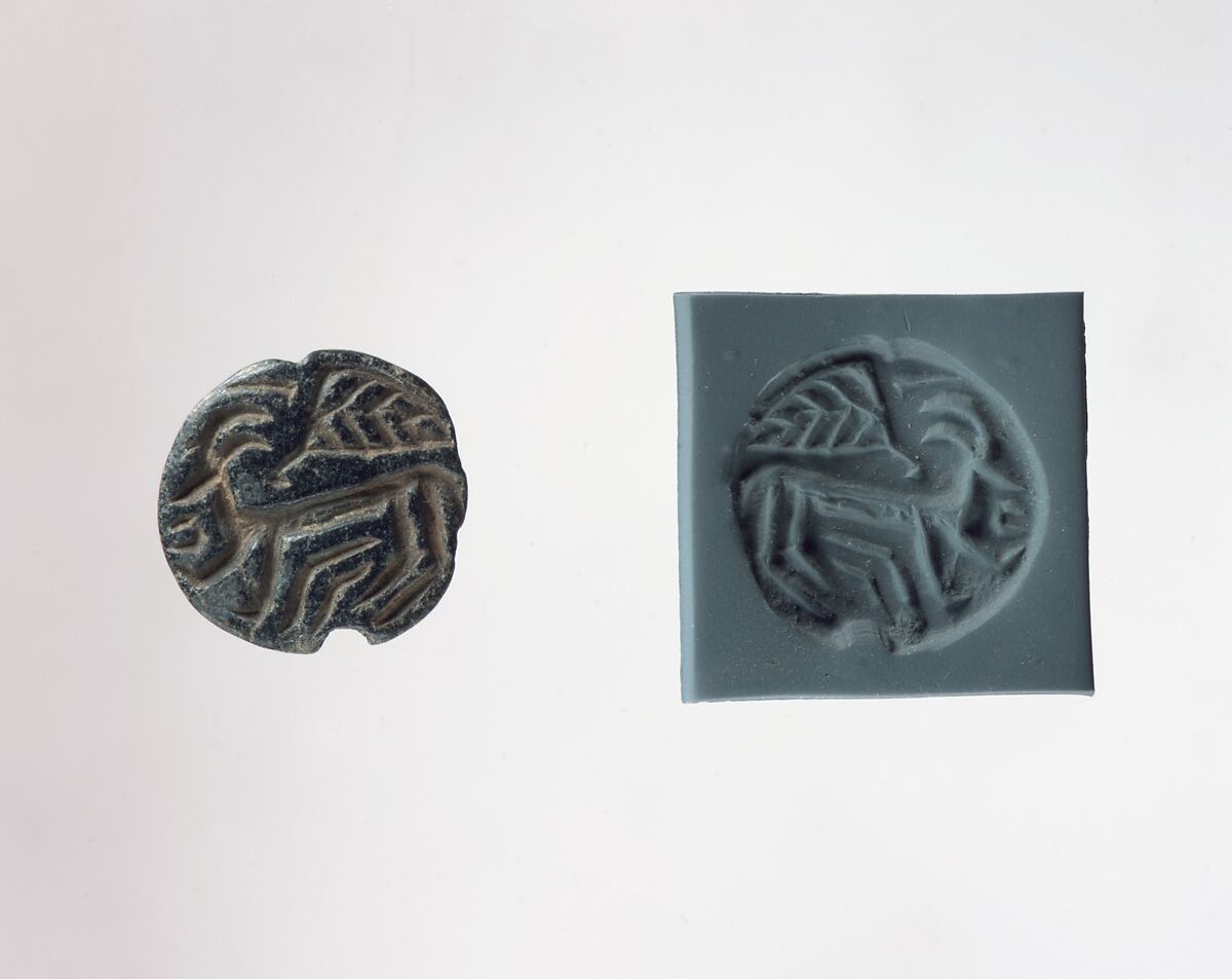 The impressing of carved stones into clay to seal containers had a long tradition in Mesopotamia, with the earliest evidence found in Syria dating to the seventh millennium B.C. During the Ubaid period, the variety of designs carved on seals expanded from simple geometric forms to include animals with humans, snakes, and birds. Seals like this one with deeply carved animal motifs became characteristic of northern Syria and southeastern Anatolia. It is decorated with a four-legged horned animal. Above the animal is a leaf shape, possibly a stylized bird, while two bent lines under its body may represent vegetation or perhaps snakes.