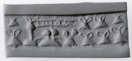 - Title:Cylinder seal and modern impression: "pigtailed" ladies in front of loom (?); containers with loop handle