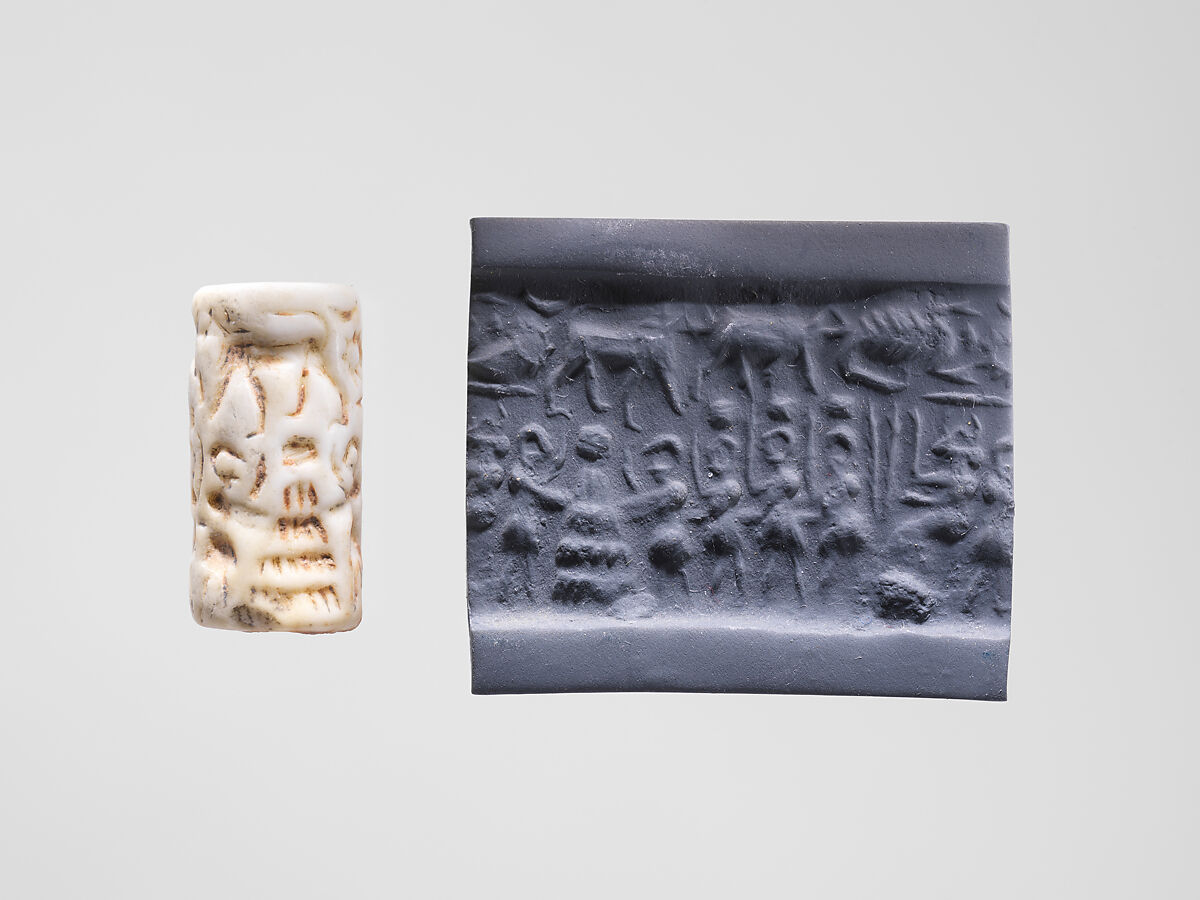 - Title: Cylinder seal and modern impression: seated goddess before figures carrying boxes, one placed on "altar"