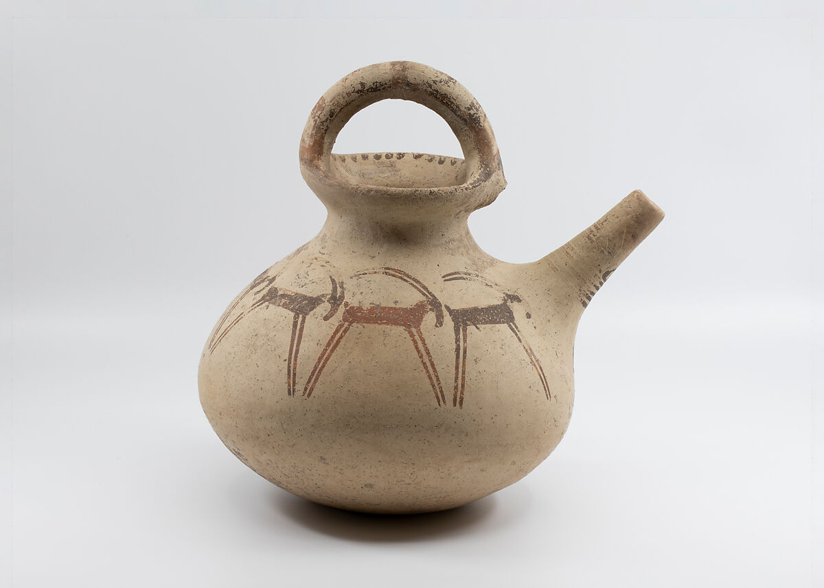 This pitcher has a globular body with a narrow neck and an everted rim. A tubular spout emerges from the body at a roughly forty-five degree angle. A semicircular handle is attached to the rim. It is made of a buff clay with red-brown painted decorations, including parallel lines on the spout, dots around the rim, and a row of stylized ibexes on the body. The ibexes have lozenge-shaped bodies, legs, tails and penises indicated by straight lines, and necks, heads and horns represented by curved lines. The pitcher is handmade, but probably finished on a wheel.