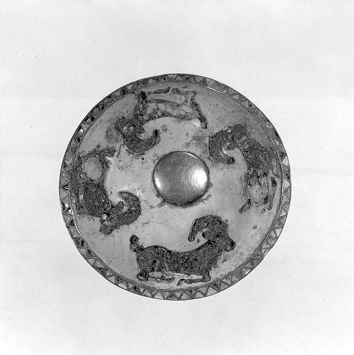 This dome-shaped object may have decorated a pommel, the knob on the end of a dagger or sword handle opposite the blade. It is composed of a disc of shell, attached to a copper alloy backing by a rivet going through the center. The head of the rivet is covered with a sheet of gold foil. Around the edge of the disc runs a decorative pattern, formed of a gold foil frame arranged in a pattern of interlocking triangles, into which small inlays were set. Many of these small inlays have deteriorated or been lost completely, and those which remain appear to be made of carved shell. Inlaid into the surface of the disc are four rams, shown in profile and arranged head-to-tail with heads toward the center. In many areas of the shell surface that was hollowed out to form the bodies of the rams, a black residue is visible. This may be traces of bitumen, a tar-like substance that was used as an adhesive. The outlines of the rams are formed from strips of gold foil that may originally have been set into bitumen. Their bodies were inlaid in a contrasting material, perhaps a soft stone, which has now deteriorated into a powdery substance.