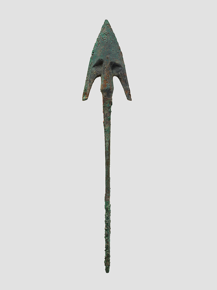 One class of weapons excavated in northwestern Iran and Transcaucasia is the cast bronze arrowhead with a triangular head, raised midrib, and tang (shaft) that is usually square or rectangular in section. This arrowhead is of that type pictured along with five other examples (MMA 1991.314.3–.8). This type seems to have been used in small numbers even when generally replaced by socketed bronze arrowheads in this area in about the seventh century B.C.