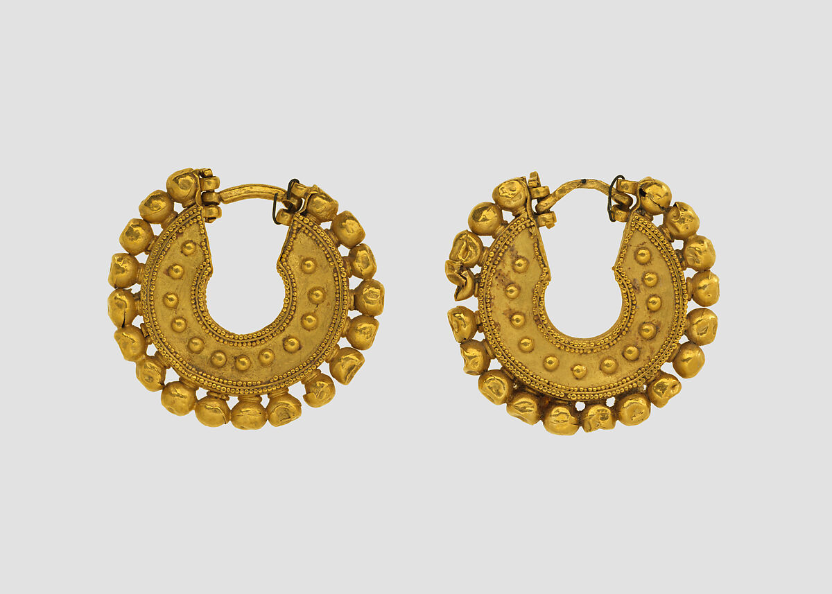 These earrings are typical of Achaemenid Persian jewelry. Earrings of similar shape have been excavated at Susa and Pasargadae, and they are depicted at Susa and Persepolis, where they are shown being worn by men.