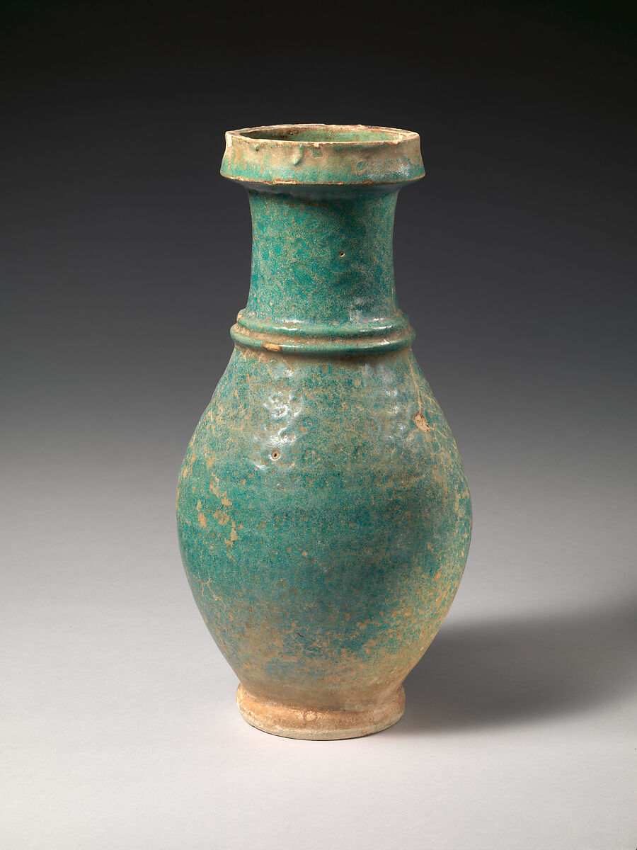 A green-blue glaze covers the jar’s exterior and its interior is coated with bitumen. Two concentric bands encircle the neck. Ceramics glazed in green, blue-green, and yellow were produced in Mesopotamia and southwest Iran during the Sasanian period. The dating of Sasanian pottery is complicated due to the lack of examples from controlled excavations at Sasanian sites, however, in contrast to ceramics produced during the Islamic period, glazes cover Sasanian vessels uniformly and additional designs are not defined through the use of differently colored glazes.