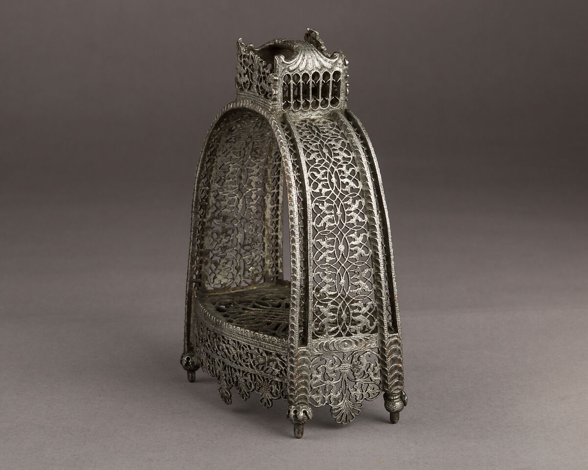 This technique of piercing a very thin plate of metal with very intricate designs, creating a true metallic lacework, is found on deluxe equestrian equipment in Bohemia since the 15th century, as on the spurs and stirrups made in Prague for King Casimir II of Poland ca. 1455 (Vienna, Kunsthistorishes museum). Such quality could only be achieved by the best craftsmen. Ironwork masterpieces like this stirrup, however, were actually so fragile than they would only be used occasionally for ceremonial purposes.