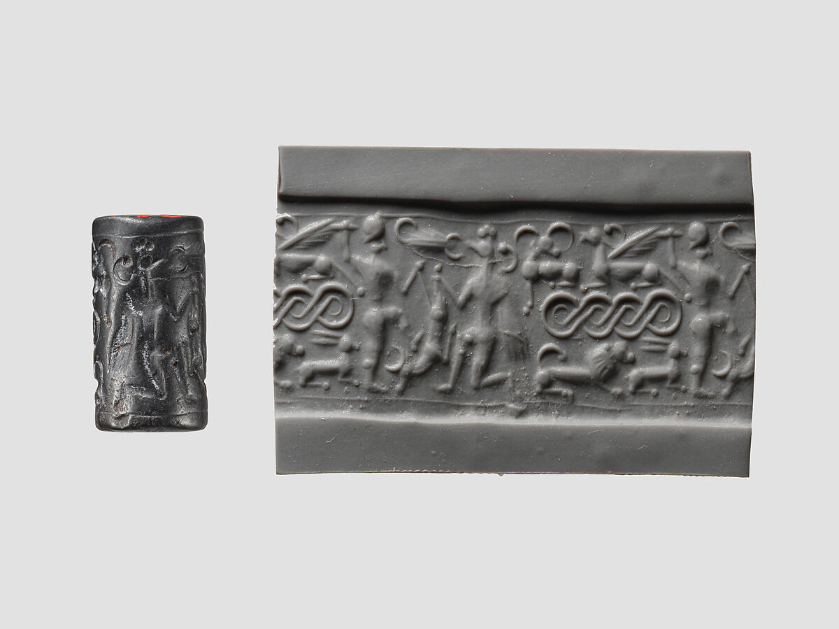- Title: Cylinder seal and modern impression: male and griffin demon slaying animal; terminal: animal attack scenes, guilloche
