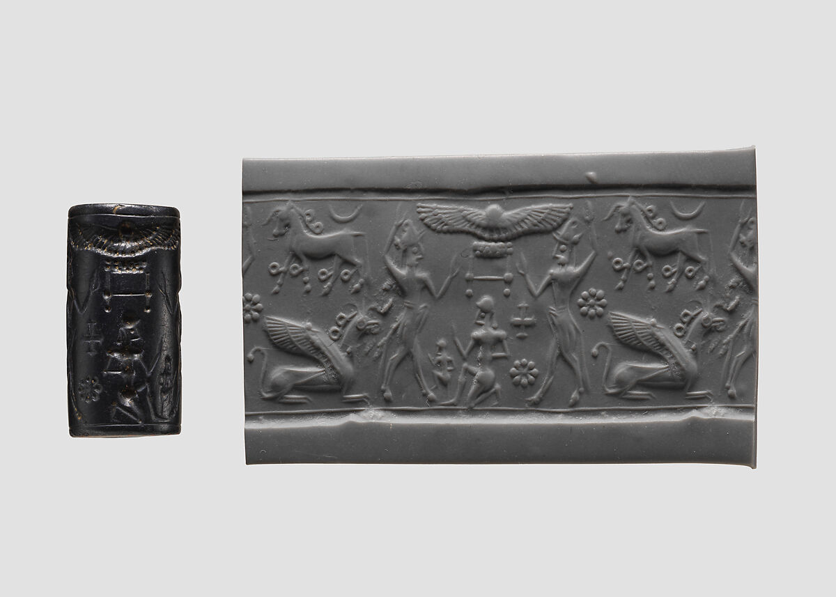 - Title:Cylinder seal and modern impression: two bullmen flanking sun-disc; horse, griffin