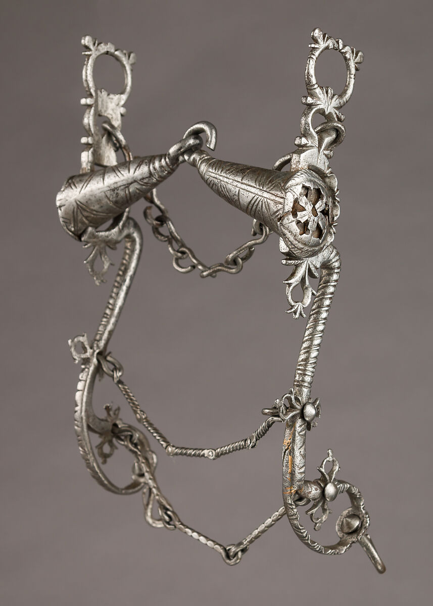This kind of bit, with its engraved, pierced and chiseled ornamentation, is a very common type of German 17th-century bit, found in many collections. They might have been pre-made generic bits, mounted with mouthpieces and shanks of regular strength suitable for most horses.