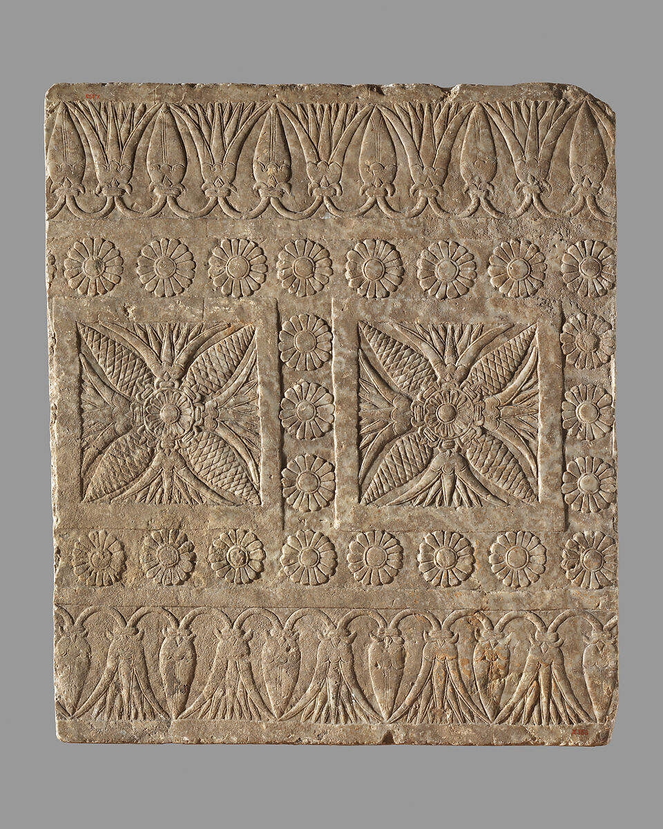 The Assyrian palaces were filled with fine carpets and hangings, but none survive. With fluctuating moisture levels and often very high salinity, the Mesopotamian soil is not well suited to the preservation of organic materials. Unlike in Egypt, where very stable dry conditions have allowed significant quantities of textiles to survive, the recovery of textile fragments in Mesopotamian archaeology is rare. Representations of textiles in other media help to compensate for this loss, particularly when, as here, the designs and patterns that would have been used in real carpets are depicted in detail.