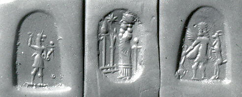 - Title: Stamp seal (octagonal pyramid) with cultic scene, demon, and two-figure contest