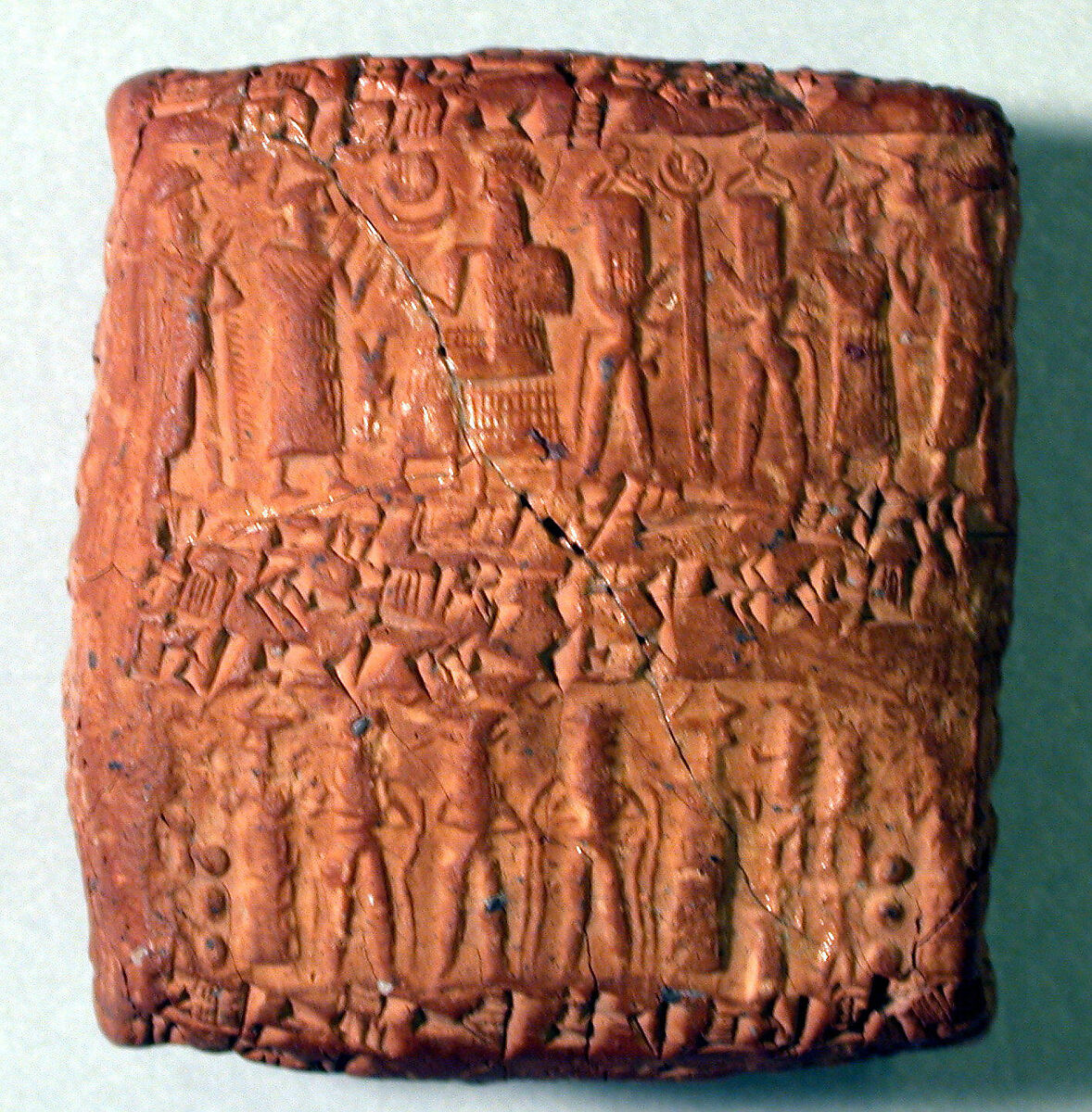 This sealed clay envelope or case contained a tablet documenting the discharge from debt for a copper loan owed to Enlil-bani. The contents of the tablet was repeated on the envelope, in order to verify the decision regarding the loan repayment without tampering with the document inside. Text on the envelope, read from left to right, must have been written after the original text was placed inside the case. The three seal impressions on the sides and edges of the tablet all belong to seals carved in the linear Old Assyrian style displaying traditional Mesopotamian scenes. An impression present on both the front and back of the tablet depicts two nude bearded heroes, with streams of water flowing from the shoulders, flanking a frontal bullman. Two suppliant goddesses flanking a double register of rampant felines complete the scene. The other impression on the front of the tablet depicts a hero grasping a snake while a second hero wrestles a rampant feline. Two human-headed bulls with frontal faces stand opposed as another hero wrestles the one on the left. The highly linear and almost abstract rendering of the figures and faces is common in glyptic art from Kanesh. The impression appearing on the back of the tablet depicts a typical presentation scene with an interceding goddess leading a bearded male figure toward a seated deified king who sits below a cross-disk in a moon crescent. Two bullmen hold a standard topped with the same motif. Common filler motifs of a star, small upside-down man, and vessel can be seen the field.