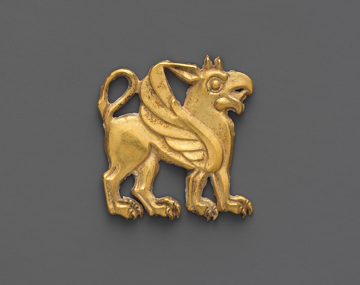 This ornament, with a small loop on the back meant for attachment to clothing, is from a large group of gold plaques acquired by Western museums, including The Metropolitan Museum of Art, in the first decades of the twentieth century. They are thought to come from the area in the northern part of the Black Sea, reportedly from the site of Maikop in the Northern Caucasus. The plaques from this group include images of stags, floral and geometric designs, and griffins like this.