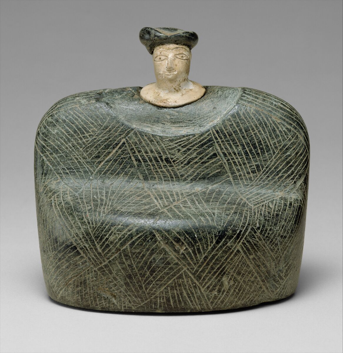 Among the few three-dimensional images assigned to this period in Central Asia are a group of stone female figures seated or squatting on a platform and wearing a robe decorated with a pattern, perhaps imitating sheep's fleece. They are always composite figures of soft green chlorite or steatite, with heads of white limestone. This example has a typical abstract form with an armless body and legs represented by a protruding ledge.