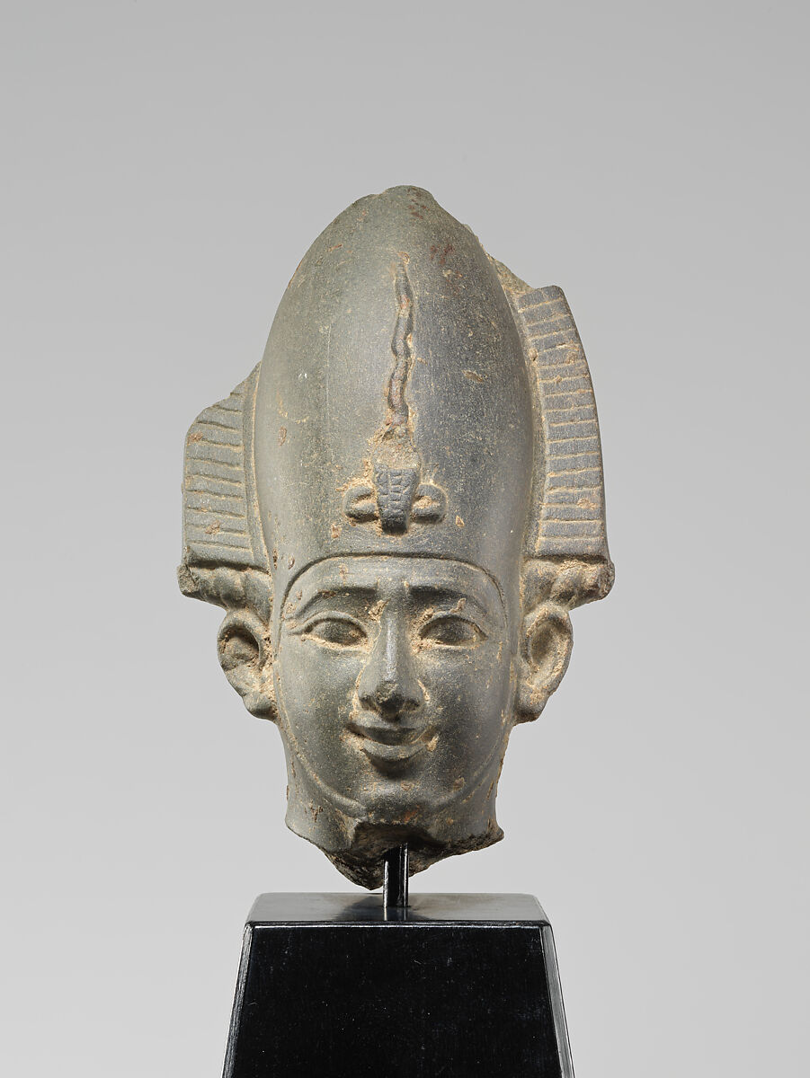 This head is from a statuette of Osiris, principal god of the afterlife and ruler of the Netherworld. The deity is shown wearing his typical "atef" crown, a tall crown flanked by ram's horns and ostrich plumes and protected by a hooding cobra. His face is placid and his serene affect enhanced by a slight smile. Only the very top of his false beard and the straps that would have held it in place are preserved. The tip of the crown, as well as the tops of the feathers and the tips of the horns that flanked it are gone, and the head has been broken away from the body.