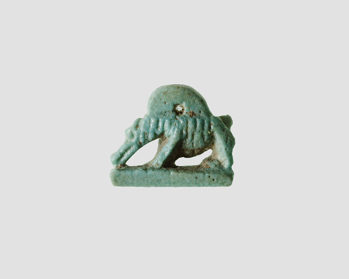 This tiny sow features a loop at the top and was used as an amulet. Sows are connected to the sky goddess Nut, who was thought to give birth to the stars each night and swallow them at dawn. Ancient Egyptians sometimes depicted her as a sow, based on the animal’s behavior to eat her own piglets. However, Nut was seen as a protective and motherly goddess and an amulet in the shape of a sow was probably meant to protect its wearer.