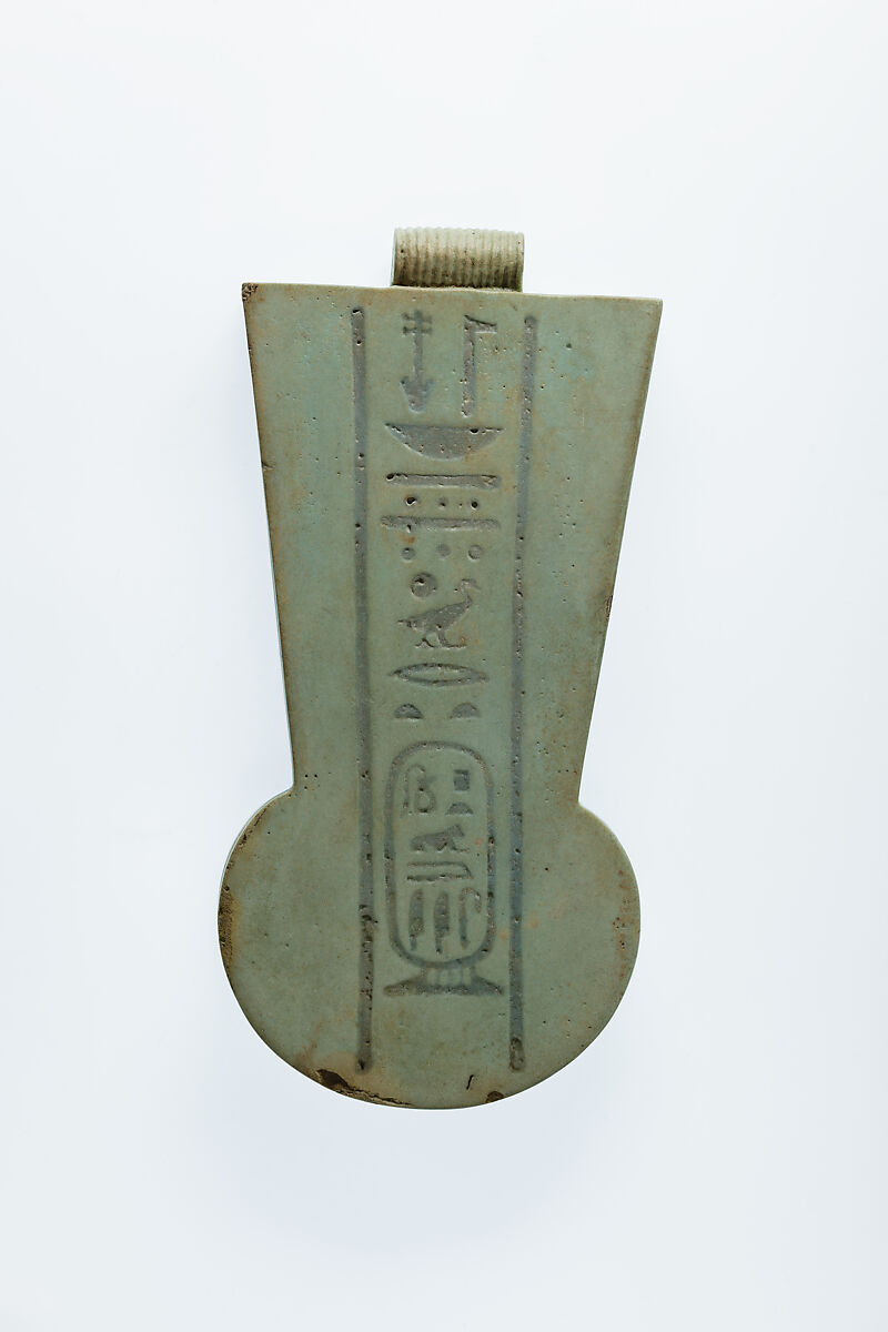 The menat is a ritual necklace consisting of multiple strings of beads attached to a counterweight, also called a menat, shaped like a pendulum. The necklace could be worn by the goddess Hathor or by others associated with her. The counterweight alone was a magical symbol of the goddess Hathor, and in the New Kingdom and later, small menats were dedicated to the goddess by kings and visitors to her sanctuaries. The Menat here is inscribed with the name of Ptolemy I or the II, the first kings of their dynasty.