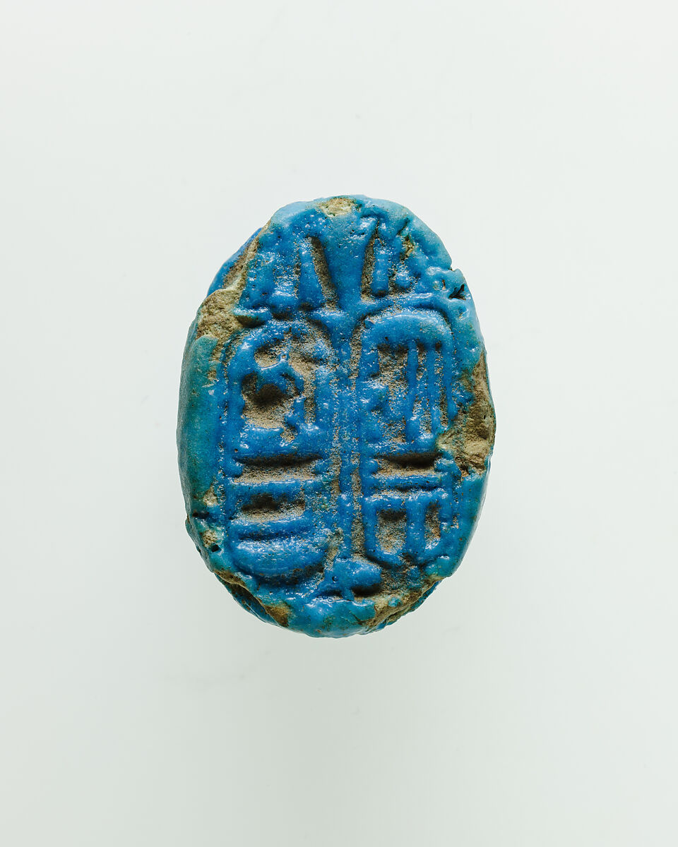 The underside of the scarab is decorated with two royal cartouches, each surmounted by sun disk flanked by ostrich feathers. The cartouches contain the prenomen and nomen of Seti II, Userkheperre-meramun Seti-merneptah. Only few seals are known on which both names appear together and, moreover, most of these are plaques.