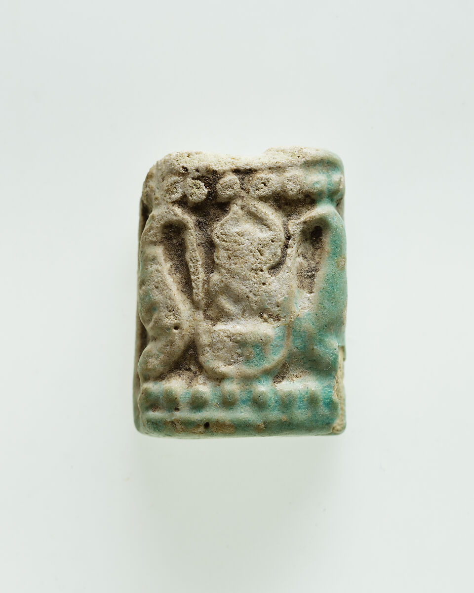 The top of this rectangular plaque is decorated with a pair of uraei linked by their tails, flanking an incomplete version of the throne name of Thutmose III, (Men)kheperre. Despite the name of the early 18th Dynasty ruler, this plaque was carved after his reign, as indicated by the pearl strings running along the top and bottom. This decorative feature was common on plaques made during Dynasty 19–21. The later date is also confirmed by the decoration on the underside of the amulet, which shows a one-winged deity with falcon head standing behind an ostrich feather and a small uraeus. This god can be identified as the sun god Re or Re-Harakhty, who predominantly appears in similar compositions on scarabs and oval stamp seals from this period.