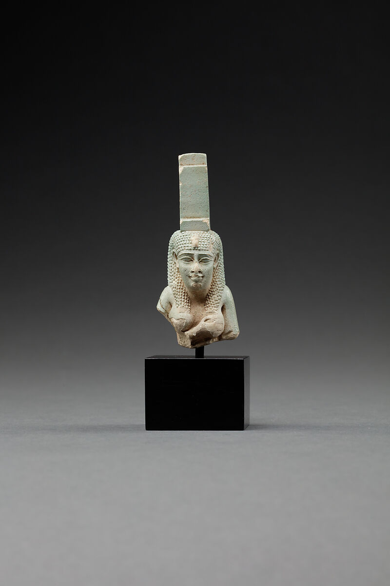 The upper part of an Isis lactans figure, when complete this would have depicted Isis nursing her Horus, her posthumous son with the god Osiris (see 55.121.5). Enough of the figure is preserved to show that the goddess is offering her breast to her baby, although his figure is now missing. On her head is the throne hieroglyph that symbolized her name.