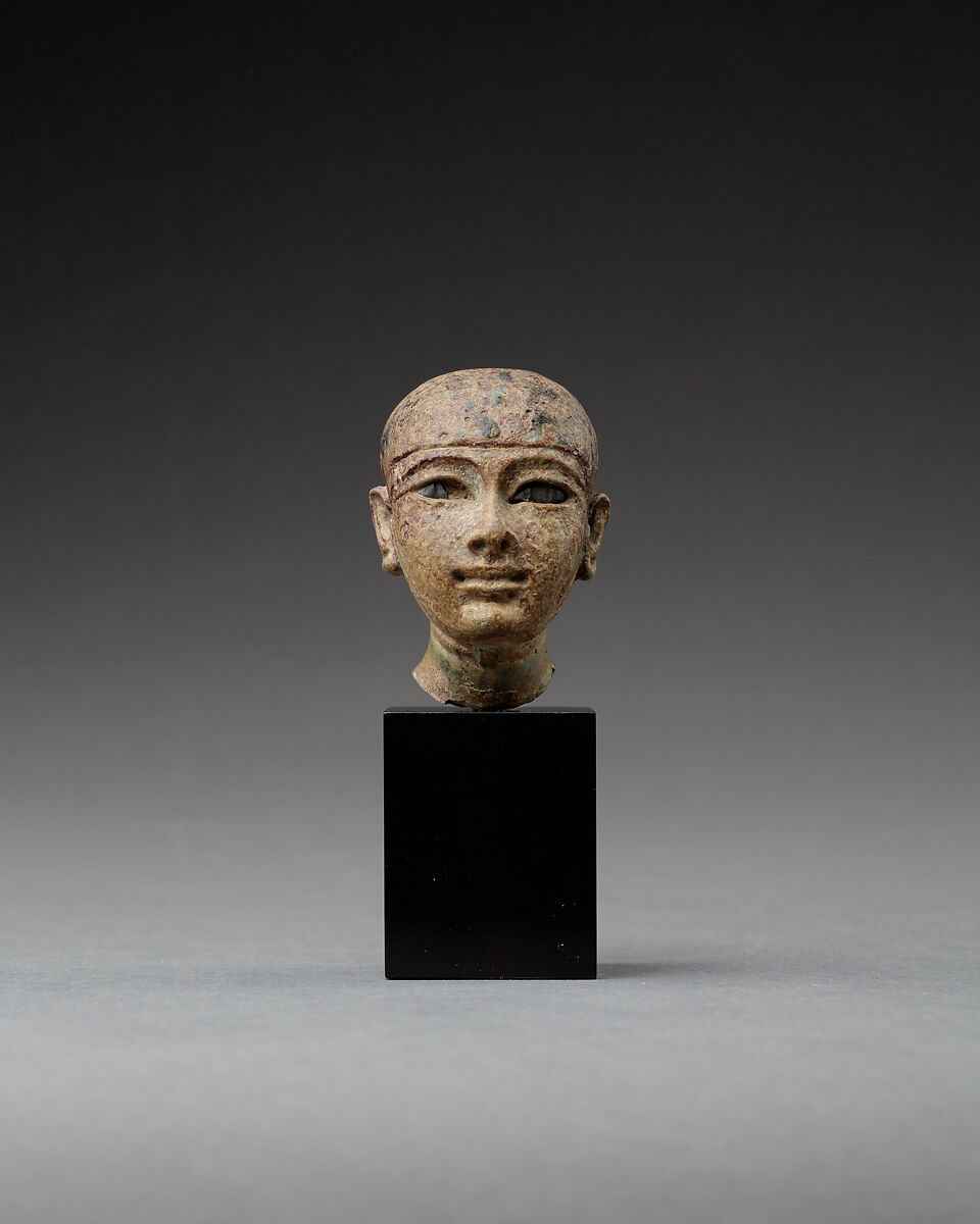 God of the city of Memphis, Ptah was primarily associated with arts and crafts. It is assumed that he acquired his designation as the creator god because of this close connection with crafstmen, builders, and artists. Small votive divine figures in faience, as well as in bronze, were deposited as offerings within Egyptian temples in order to please the gods. Concerning Ptah, the phenomenon is well known, with numerous examples of such statuettes discovered in Mit Rahina were his main temple was erected in ancient times.