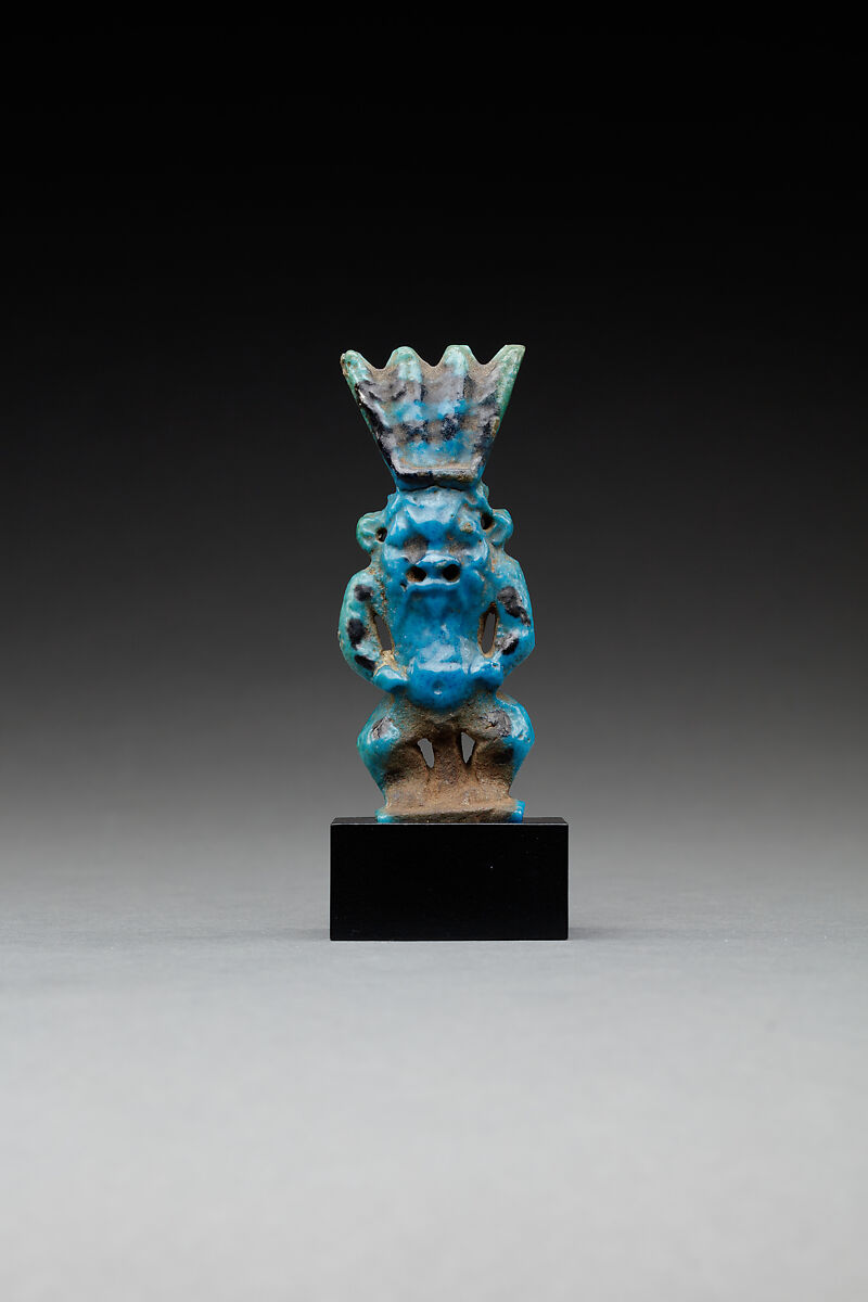 Characteristics drawn from achondroplasia are melded with that of lions to create a fierce-looking group of deities, of which this amulet represents one. They protected people during their life as well as after their death. This amulet with its bright blue color and black spots probably represents Bes, an important deity in the myth of the faraway goddess and Third Intermediate Period examples, representing characters in this story, are often made of this spotted faience.