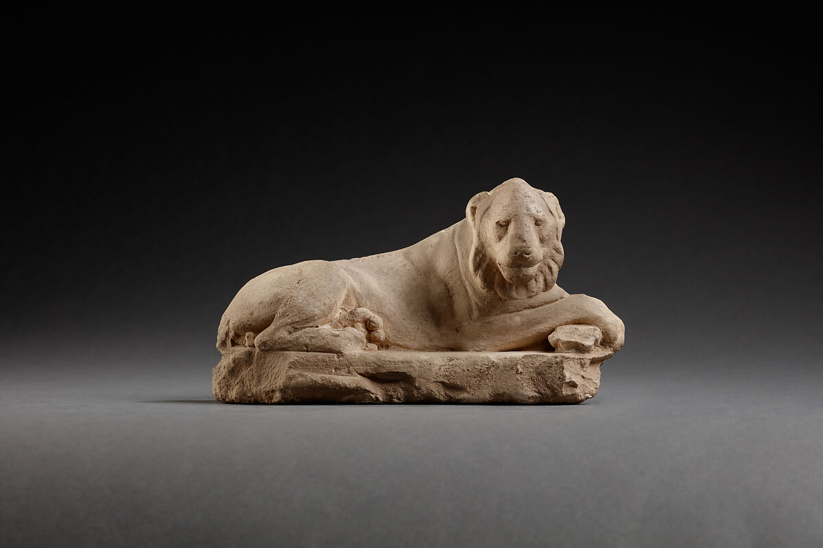 This small sculpture depicts a reclining male lion lying on his side and with his front paws crossed over each other. The artist who carved the lion clearly understood and probably observed the physiognomy of lions and marvelously transferred their relaxed position into stone while treating the body very naturalistically and with great sensitivity. Many details are shown, however the depiction of the lion's mane was only partially executed. The size of this artwork together with this feature allows to determine that the artwork belongs to an intriguing group of small sculptures and relief works that are often called sculptor’s models but that may have served as donations.