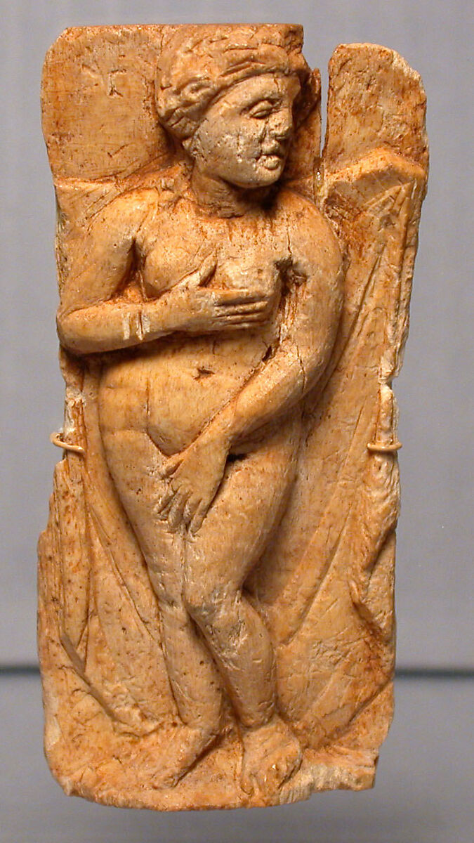Carved in relief on the convex side of a bone panel, a nude female figure stands in contrapposto with her left leg bent and left hip rotated inward. Turning her face as if to avoid our gaze, she reaches her right hand across her body to hide her breasts while her left hand covers her groin. A large cloth falls behind her body in loose folds, exposing her nakedness. This pose is known as the Venus Pudica, or "modest Venus," and refers to the ancient Greek type of female nude.