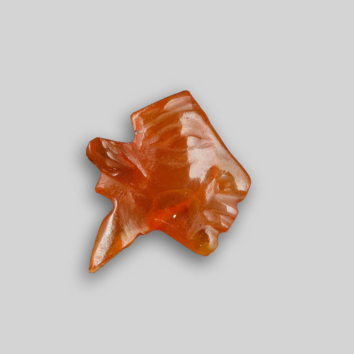 The characteristic facial features of pharaoh Akhenaten can be recognized in this carnelian inlay, in particular his high cheekbones, and fleshy lips and nostrils.