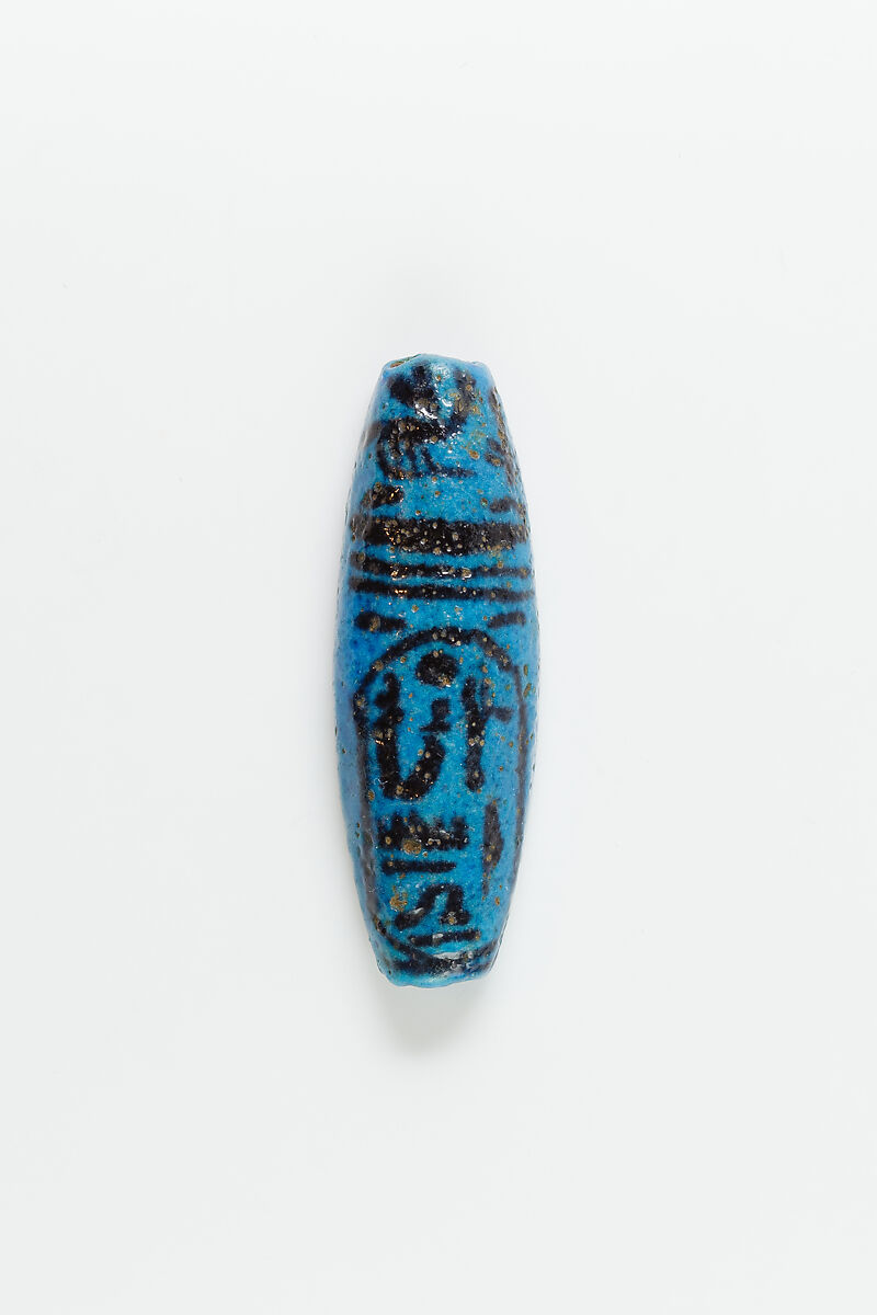 An elongated faience bead inscribed with the throne name "King of Upper and Lower Egypt, Lord of the Two Lands, Usermaatre-Setepenre." Ten kings bore this name: Ramesses IV (Dyn. 20); Amenemope (Dyn. 21); Osorkon II, Sheshonq III/IV, and Pami (Dyn. 22); Pedubaste I, Osorkon III, Takelot III, Rudamun, and Iuput II (Dyn. 23).