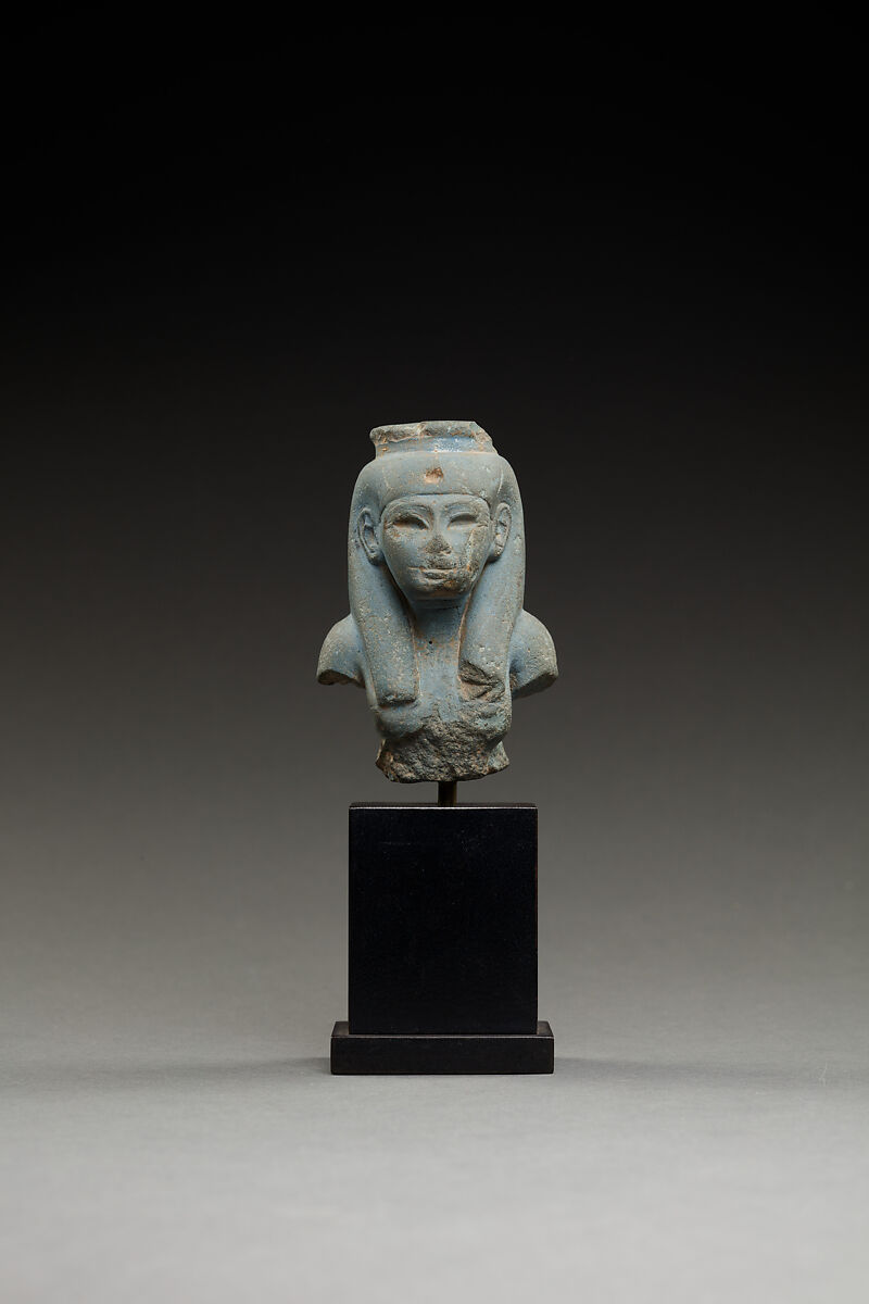 Egyptian blue was a synthetic pigment used most frequently to add color to objects composed of other materials or for small objects such as scarabs. It was occasionally also used for larger objects, such as this small sculpture representing Isis. Only the upper part of the sculpture is preserved, but in the complete piece, the goddess likely would have been shown seated, with Horus, her son with the god Osiris, on her lap (see 55.121.5). Traces on the left breast were most likely left by her missing right hand, with which she would have offered milk to her baby.