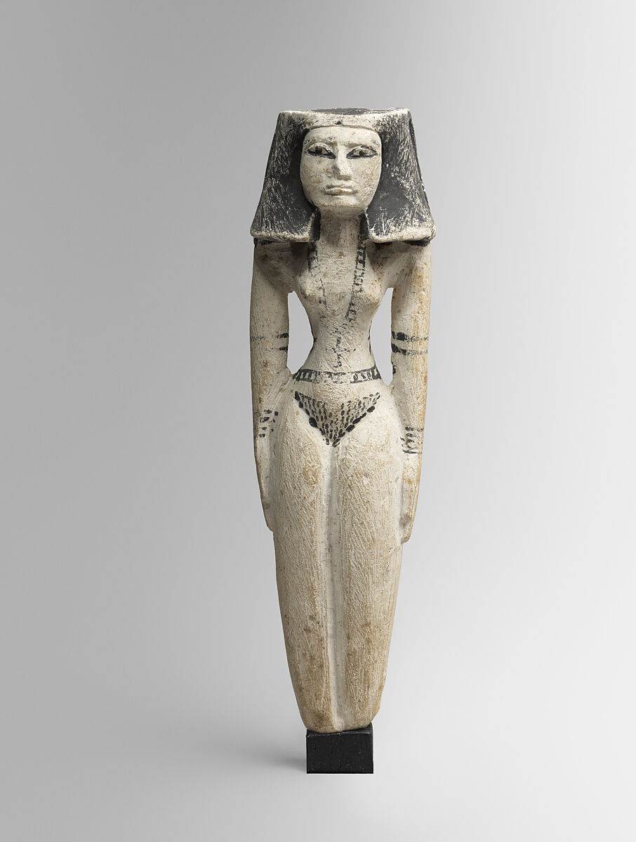 Her style is unique, however. She is adorned with numerous pieces of jewelry and an elaborate hairstyle, typical of the class of figurines, but her hairstyle is divided into three bundles: one on either side of her face and a third in the back. The hairstyle and flattened head are known from the Second Intermediate Period from a different type of female figurine, but the wasp waist and types of jewelry suggest a this lady dates to the New Kingdom.