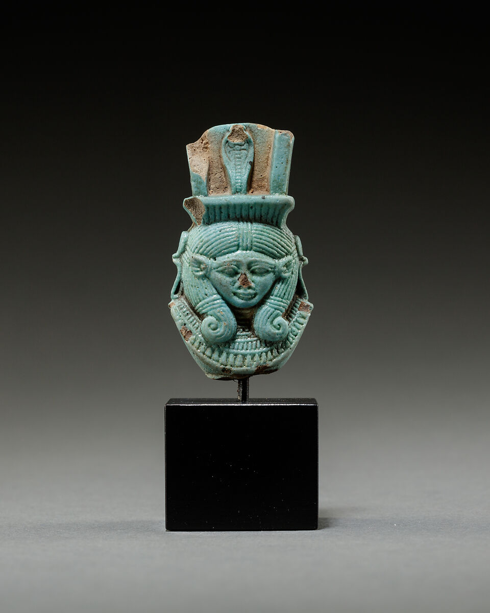 Both sides of this piece show a triangular-shaped frontal face with cow’s ears. The faces are nicely modelled and surrounded by a curled wig that is bound at intervals with ribbons. Underneath each face is a collar composed of tube and drop beads. On either side of the faces is a uraeus with a sun disk.