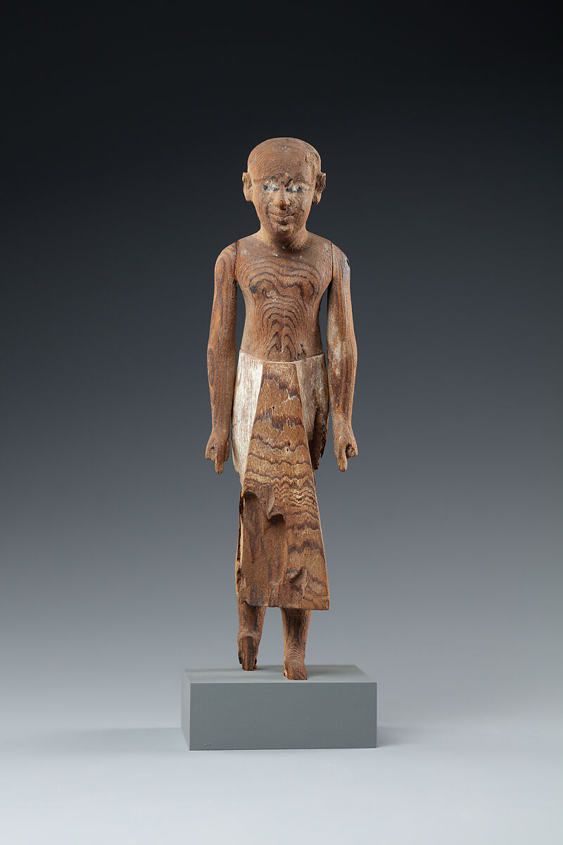 This striding man with a shaved head wears a long kilt with a broad, stiff front panel. His arms fall to the sides, and his hands are fisted. The statue was likely deposited in a burial, or perhaps stood in a cult chamber, where it received offerings on behalf of the deceased. Based on its size, style, and quality, it represents a mid-level member of Egyptian society, who had the means to commission a well-made statue of himself.