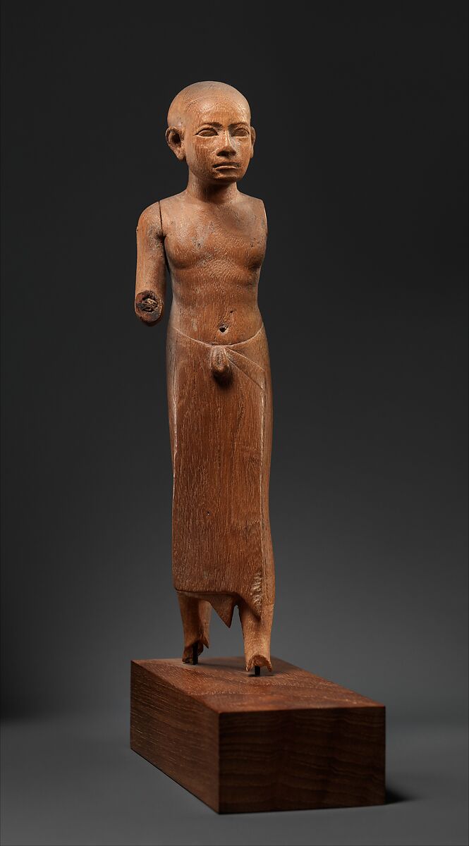 This fine statuette depicts a man with a large shaved head and a long kilt. Based on comparison with more complete statues, the figure originally held a ritual object in his outstretched proper right hand, while the left arm probably hung vertically at his side. The rounded breasts, rippled flesh, and slightly swelling abdomen all indicate a mature individual. The statue was likely originally deposited in a burial, or perhaps stood in a cult chamber, where it received offerings on behalf of the deceased.