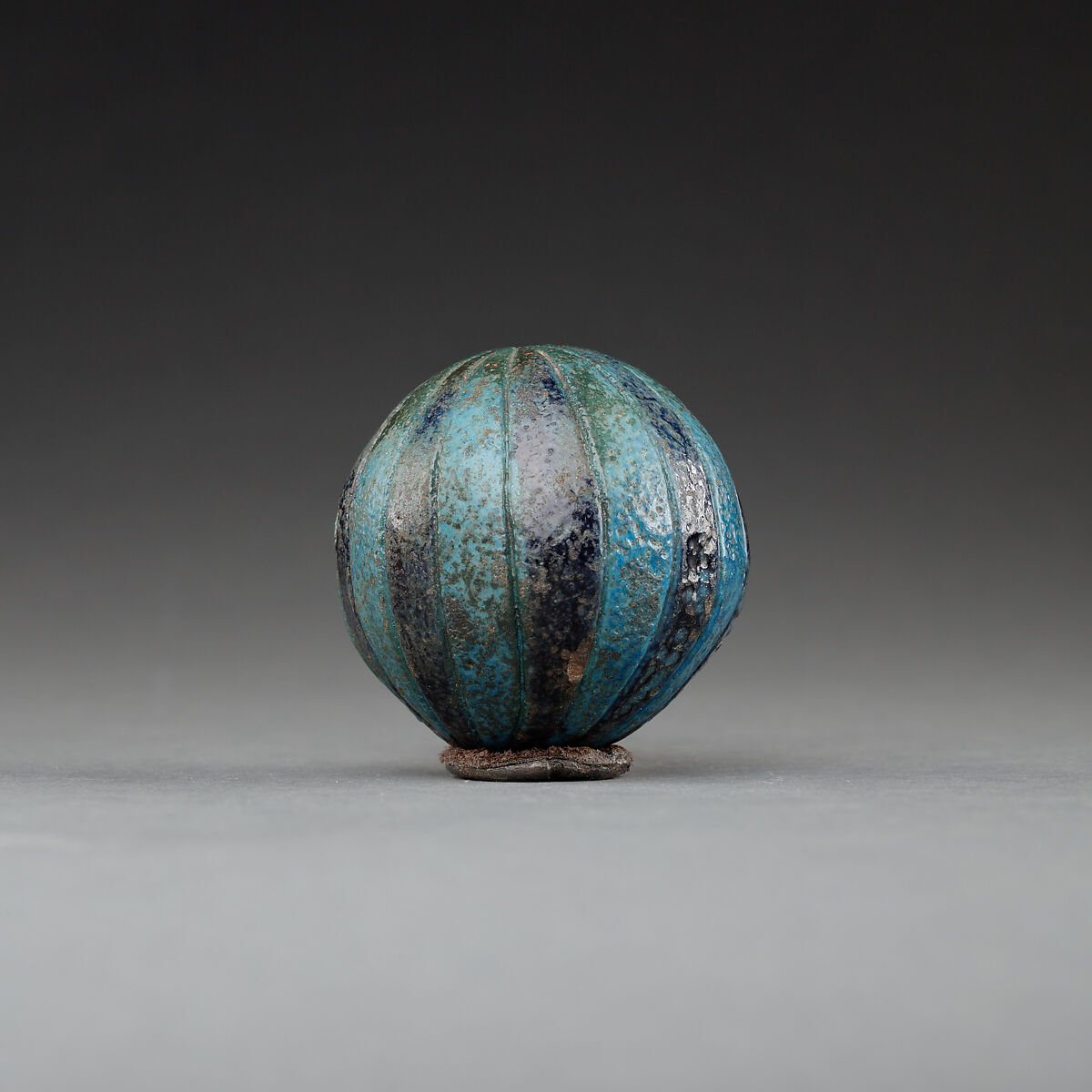This small hollow ball features alternating blue and black segments, which are additionally separated by incised lines. Such faience balls have been found at several shrines dedicated to the goddess Hathor, as well as in funerary contexts. We thus do not know for sure if this particular ball is a donation to the goddess or if it might have had a funerary function.