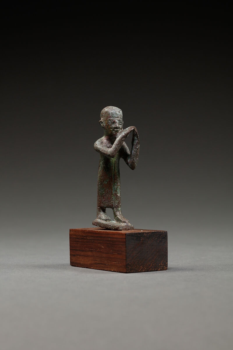 This small bronze statuette depicts a man standing on top of a base with his left leg forward. He wears a skull cap and a long straight garment wrapped at the front. The artist did not differentiate the hands from the instruments they are holding, but his raised hands clearly hold two flutes. His right hand is raised higher than the other, placing the flutes to his left, where he could breathe air into them to play them. As the man eternally plays his instruments, his figure alludes to significance of music and musicians in religious experience of the first millennium B.C.