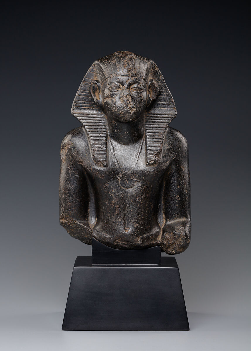 - Title:Upper Part of a Seated Statue of Pharaoh Senwosret III or Amenemhat III