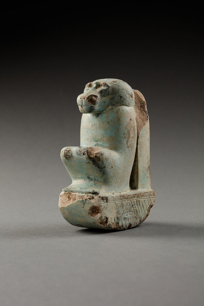 The mummiform baboon squats on a basket with a pillar behind him. The nature of this object is still under discussion. The image of the baboon might allude to the god Thoth. Only rarely do we know the archeological context to which these objects belong, but a few of them are known to come from an area in Saqqara near one of the main ibis cemeteries. Another example arrives from Hermopolis, one of the main sites in which Thoth was celebrated. In imagery, however, it is mostly kings who are represented offering an object in this form and mostly to goddesses.