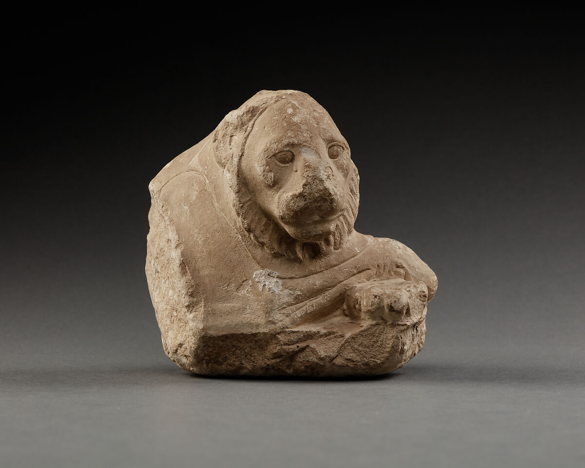 This small sculpture depicts the forepart of a reclining male lion lying on his side and with his front paws crossed over each other in a realistic and relaxed position. The lion’s body is treated in detail, however the depiction of his mane was only partially executed. The size of this artwork together with this feature allows to determine that the piece belongs to an intriguing group of small sculptures and relief works that are often called sculptor’s models but that may have served as donations.